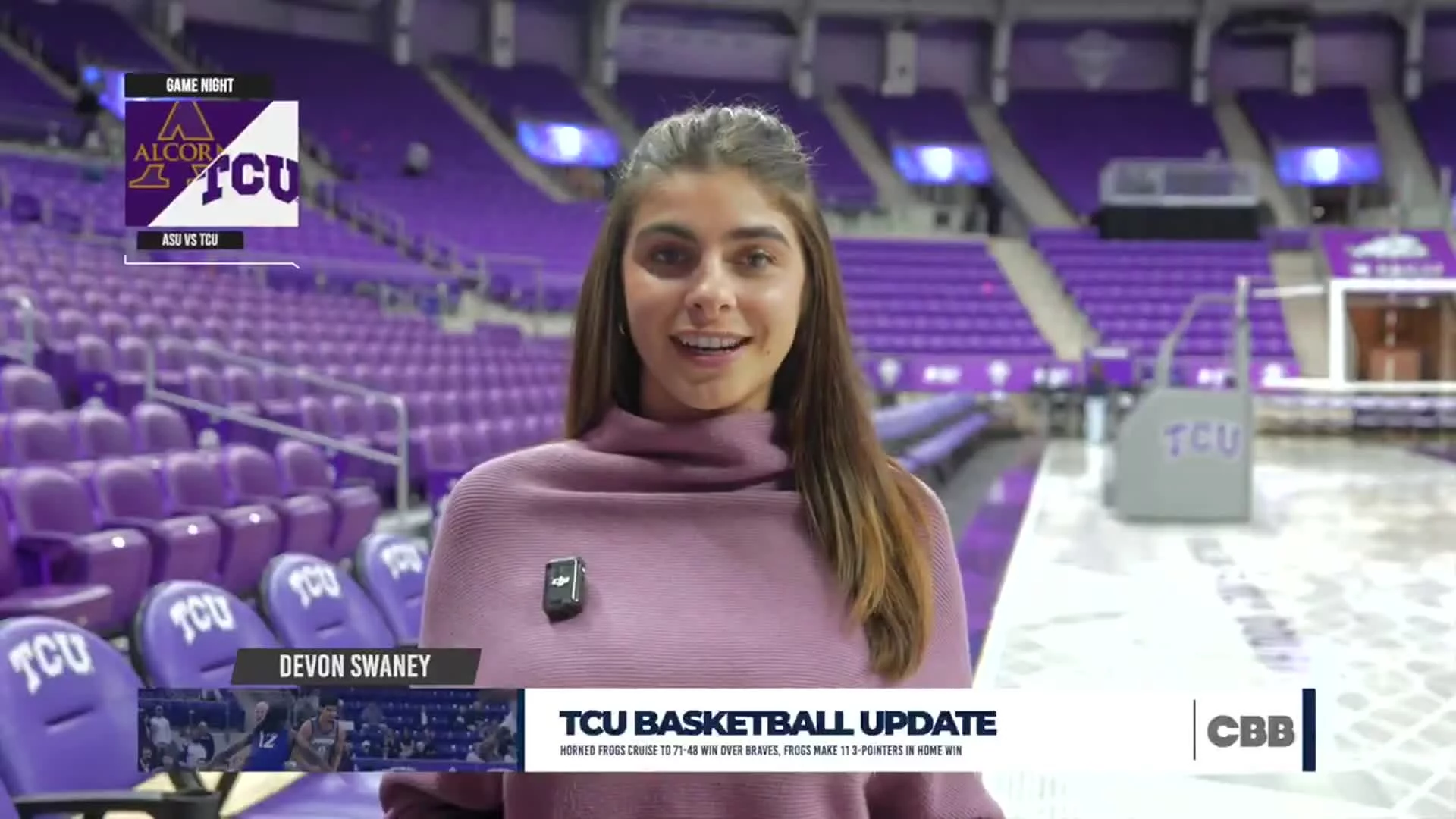 The TCU Horned Frogs dominate the Alcorn State Braves with a final score of 71-48 at Schollmaier Arena.